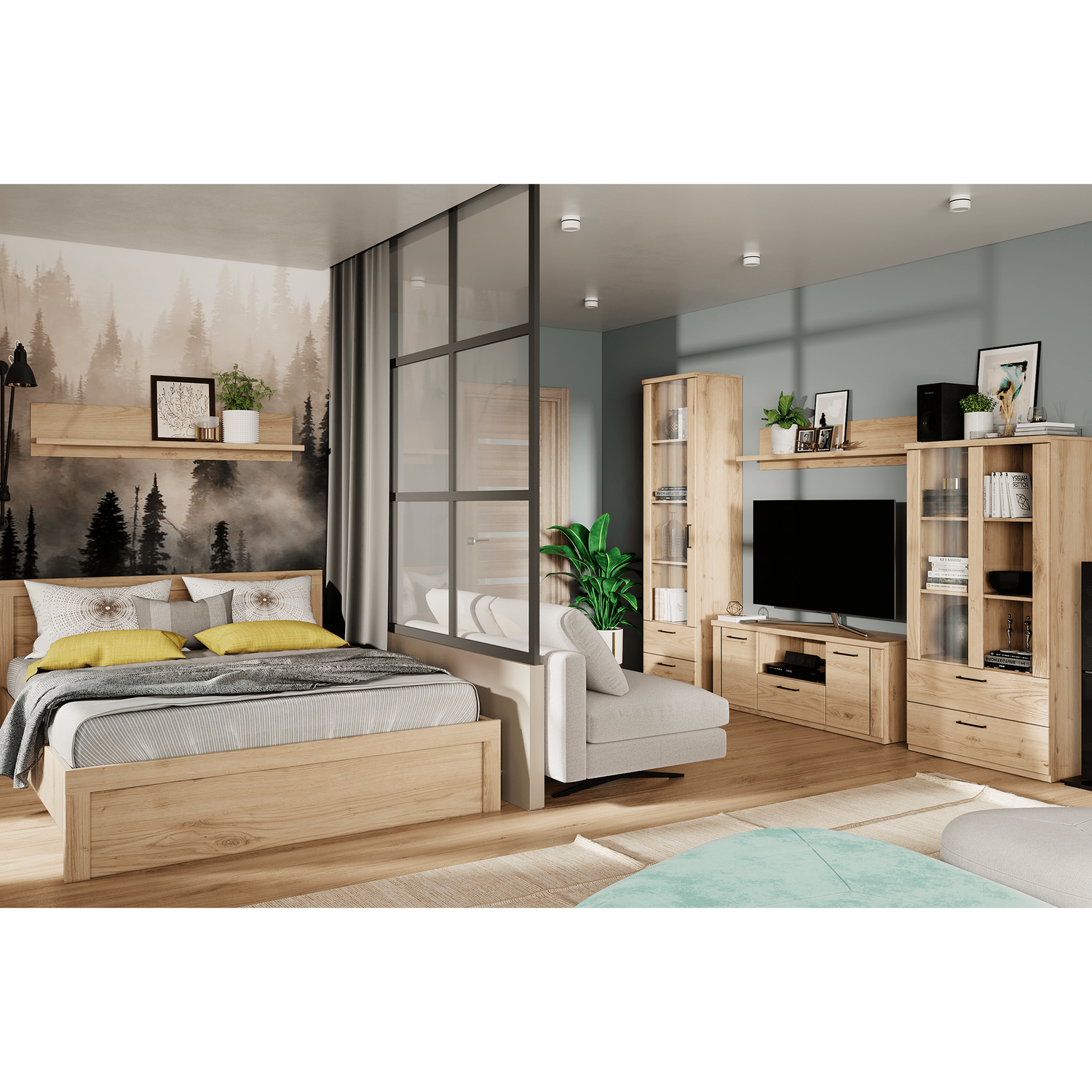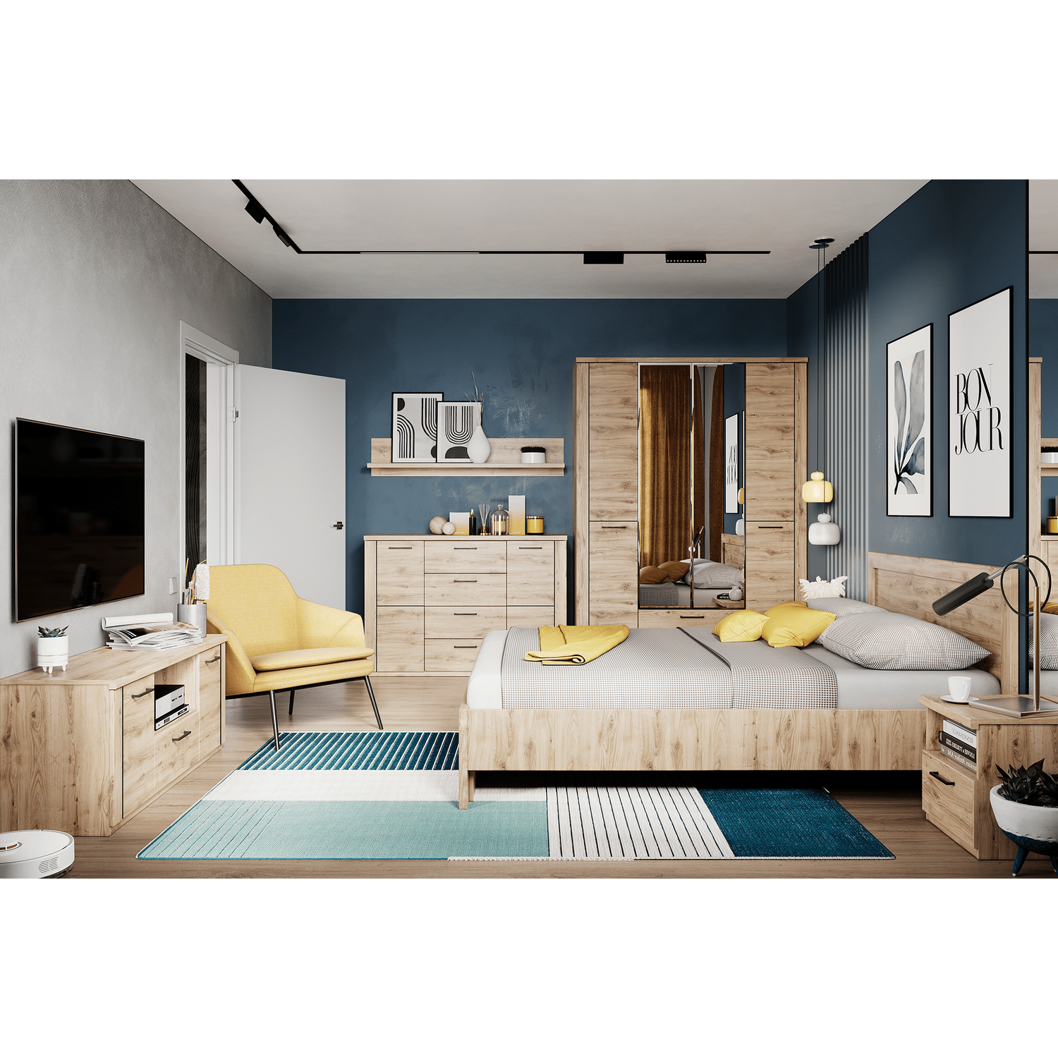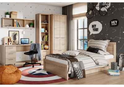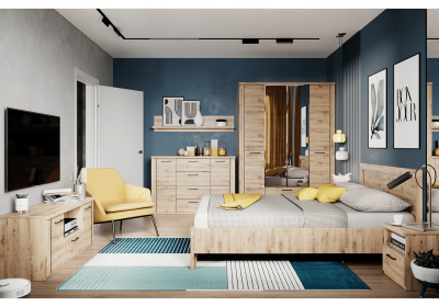Navarra tölgy bútorlap praktikus fekete fogantyúval. Elérhető bútorelemek: sarokszekrény, tárolószekrény, vitrin, polcos szekrény, nyitott szekrény, könyves szekrény, számítógép/író és étkezőasztal, falipolc, tükör, cipőtároló, fogas panel, különböző méretű és funkciójú ágyak és komódok.