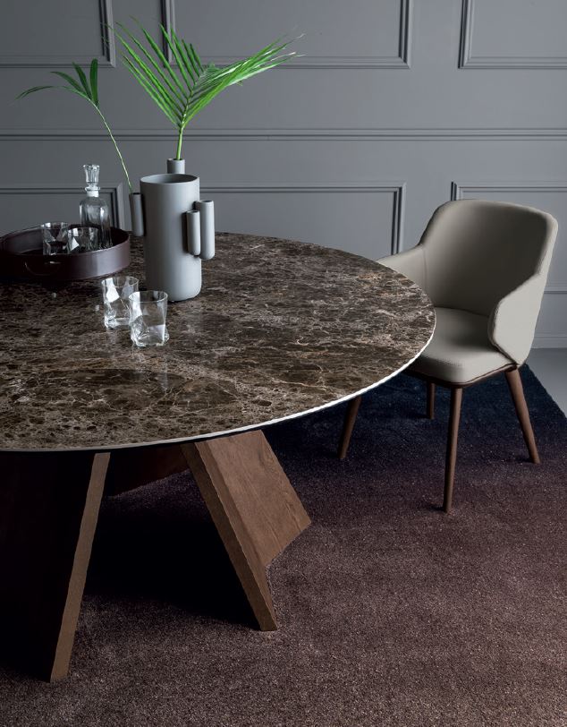 Fa lábbal, fém kerettel, kerámia vagy fa asztallappal.