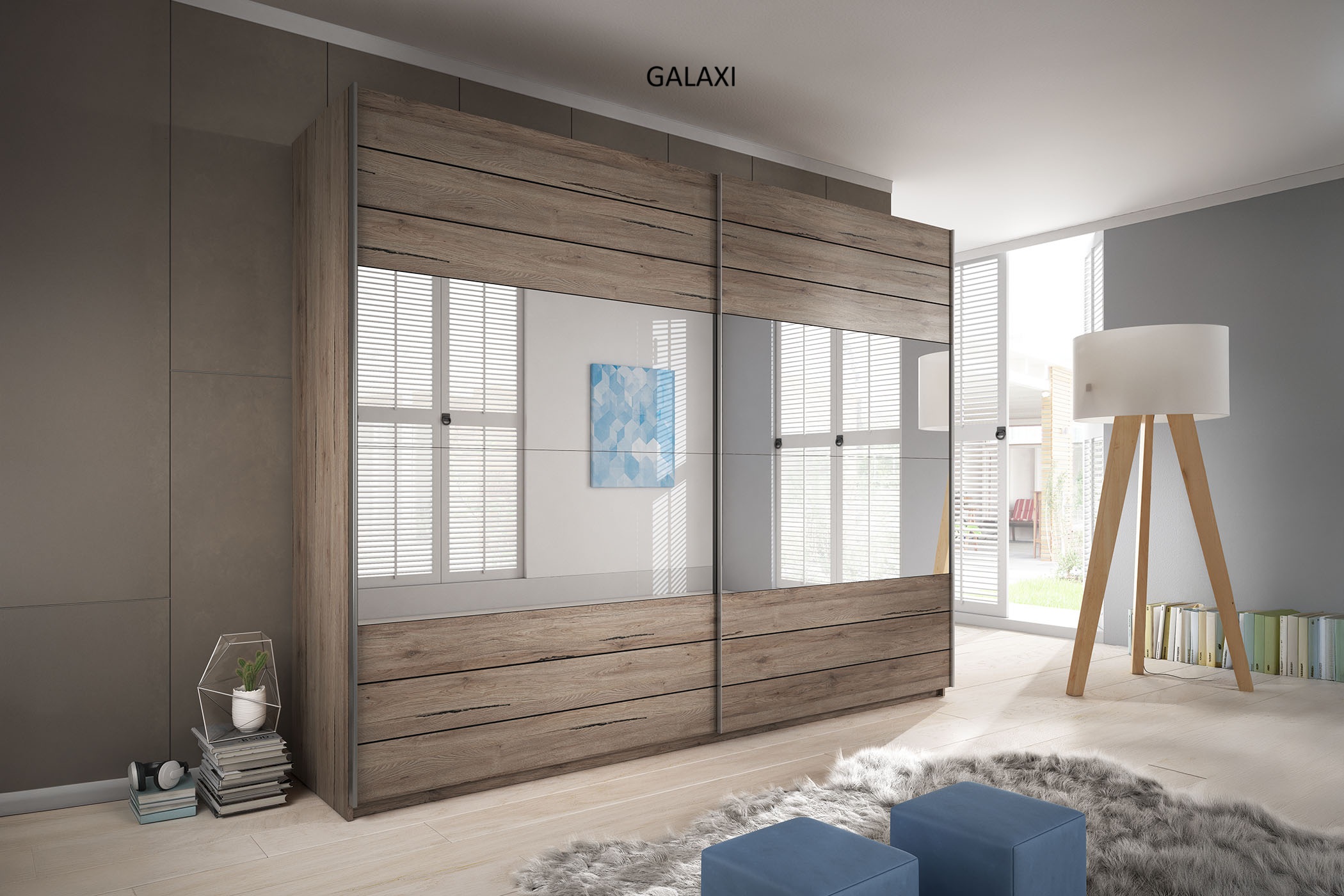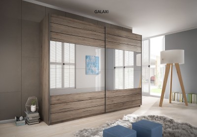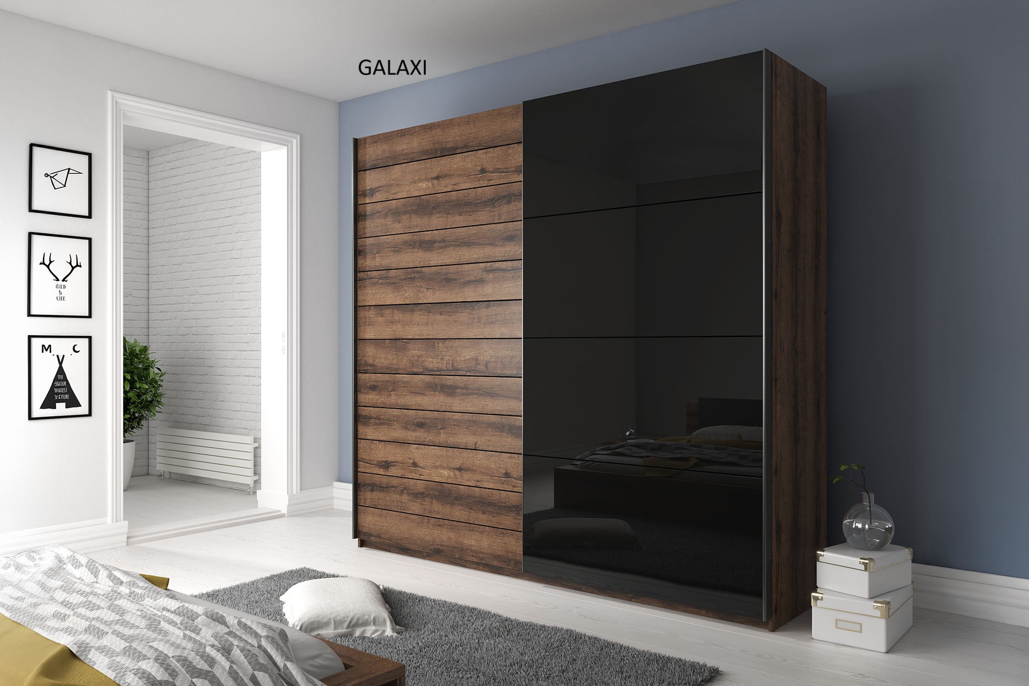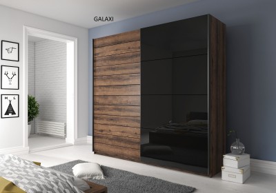 Galaxy két tolóajtós gardrób, 200 cm, 221 cm, 270 cm szélességben. Színek carbon tölgy, monastery tölgy-fekete üveg, abisko.