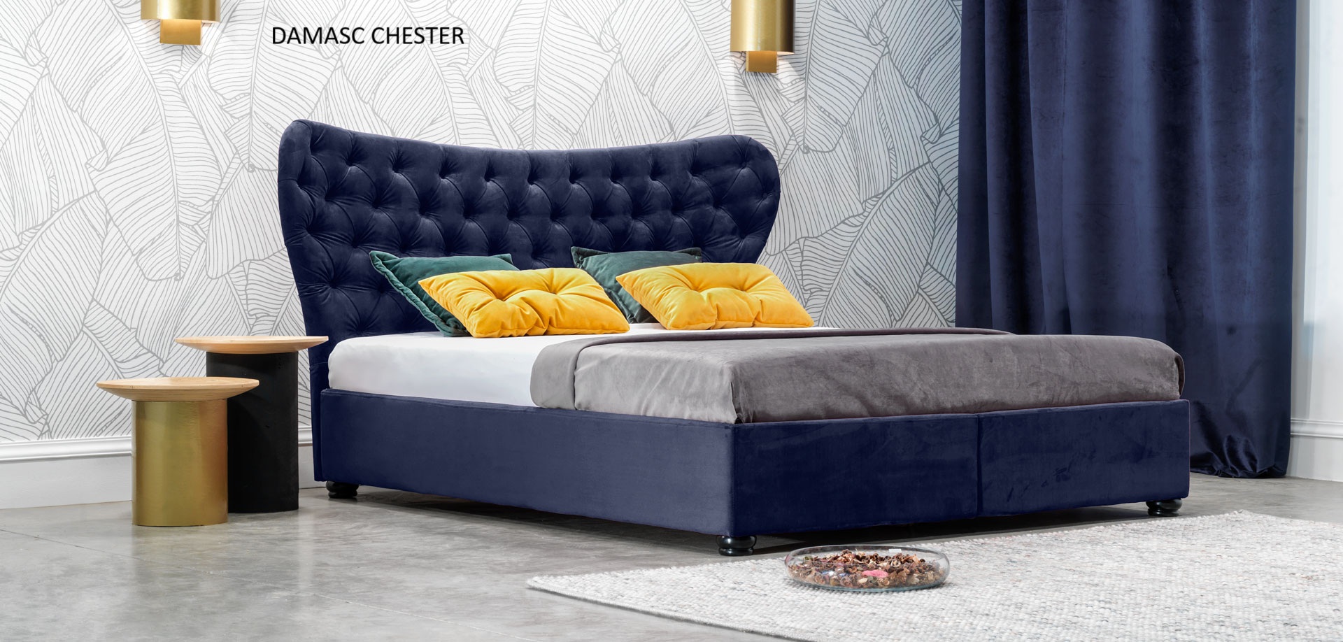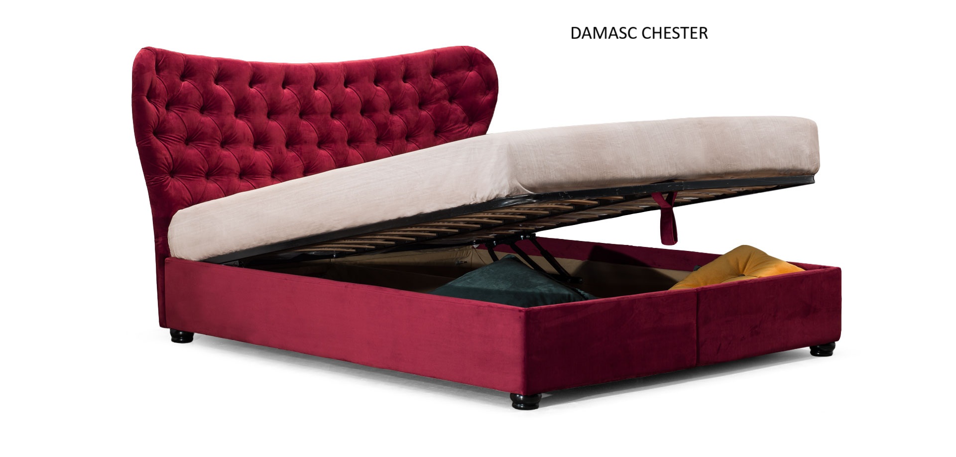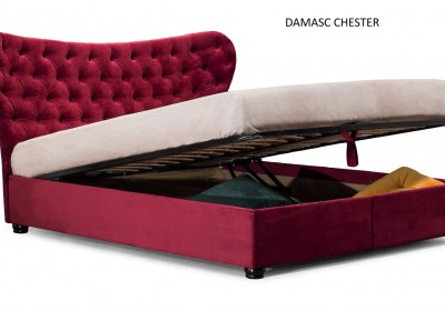 Damasc Chester ágy nagy ágyneműtartóval rendelkezik,az ágyrács fémkeret rétegelt bükkfalécekkel. Választható fekvőfelület méretek 140x200, 160x200 és 180x200 cm. Az ágy jellemzője a nagy szövetválaszték.