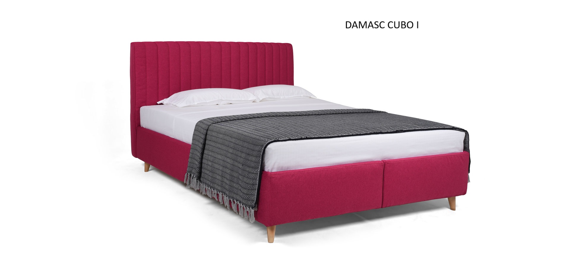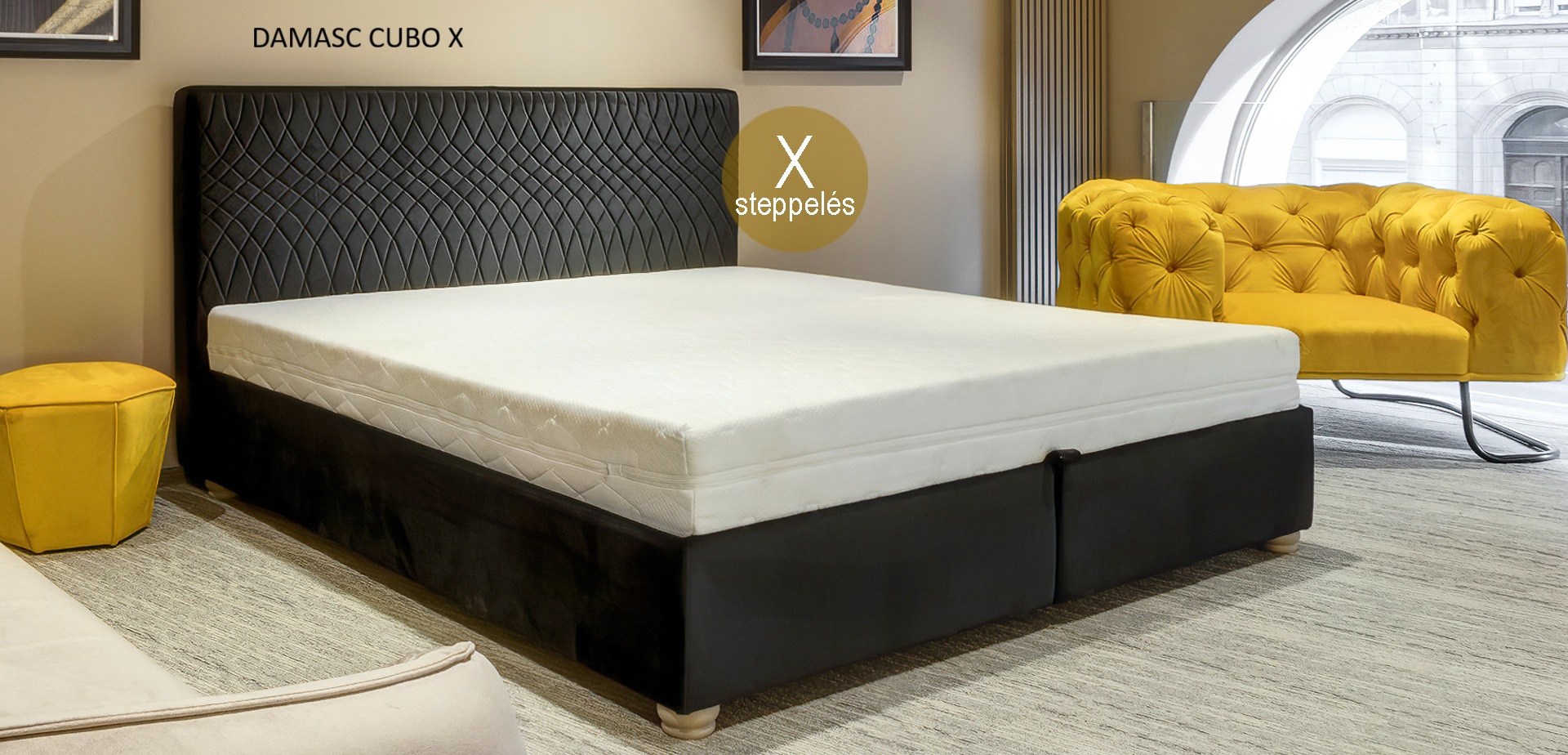 Damasc Cubo ágy szintén tárolófunkcióval rendelkezik, ágyrács fémkeret rétegelt bükkfalécekkel. Válsztható fekvőfelület méretek 90x200, 140x200, 160x200, 180x200 és 200x200 cm. Fejtámla 107 cm magas, egyenes és steppelt varrással készül, szövet választási lehetőséggel.