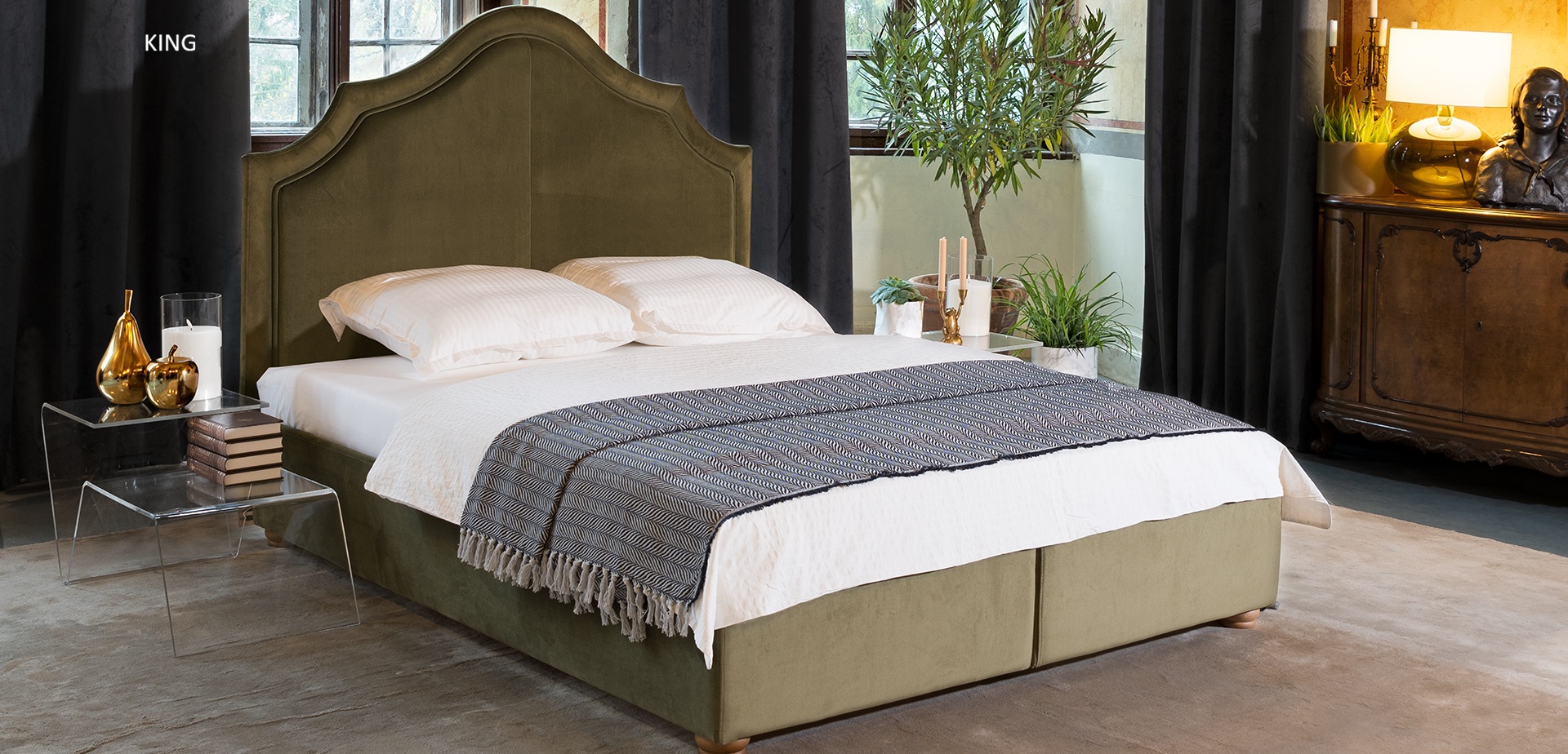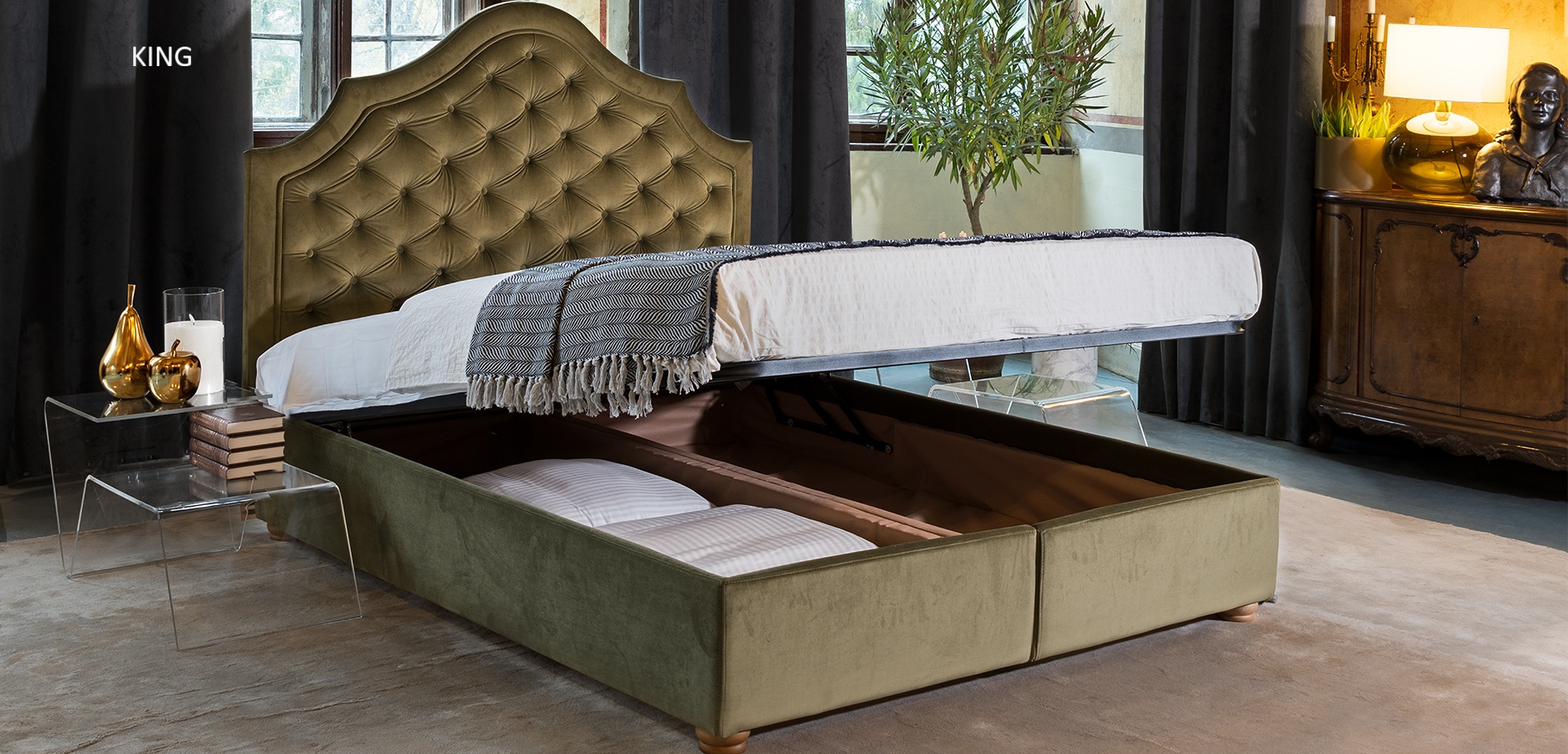 King ágy akár chester fejvéggel is elérhető, 90x200, 140x200, 160x200, 180x200 cm fekvőfelülettel. Az ágy jellemzője a tárolófunkció és a nagy szövetválaszték.
