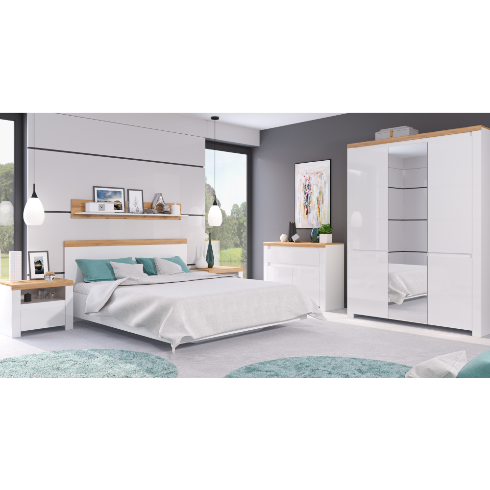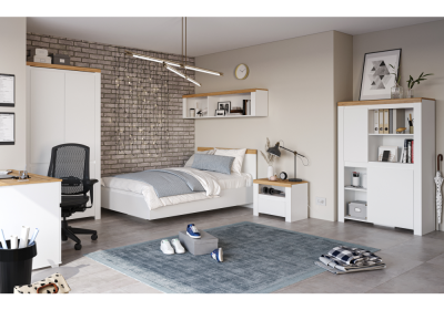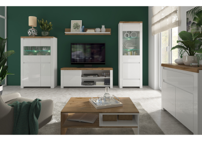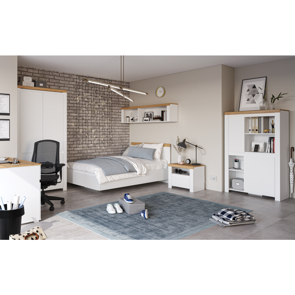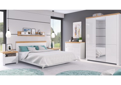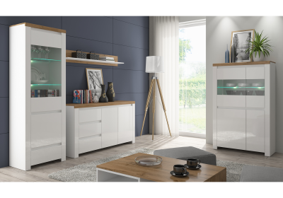 A Vilgo elemes bútorkészlet eleganciát és az időtlen megjelenést az ajtókon található fényes fehér színnek köszönheti, a wotan tölgy árnyalattal kiegészülve.